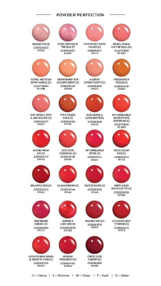 A15 – Dulce De Leche, A16 – THE THRILL OF BRAZIL, A60 – DON'T BOSSA NOVA ME AROUND, A61 – TAUPE-LESS BEACH, A69 – LIVE LOVE CARNAVAL, A70 – RED HOT RIO, B29 – DO YOU LILAC IT?, B56 – MOD ABOUT YOU, B59 – MY PRIVATE JET, B61 – OPI INK., B78 – MIAMI BEET, B86 – SHORTS STORY, C13 – COCA-COLA RED, C89 – CHOCOLATE MOOSE, D52 – RACING FOR PINKS, D53 – SUZI IS MY AVATAR, D54 – TRADING PAINT, D59 – CAN’T CTRL ME, D60 – ACHIEVEMENT UNLOCKED, D61 – N00BERRY, E44 – PINK FLAMENCO, E74 – YOU'RE SUCH AT BUDAPEST, E75 – CAN'T FIND MY CZECHBOOK, E82 – MY VAMPIRE IS BUFF, F004 – BROWN TO EARTH, F006 – RUST & RELAXATION, F007 – RED-VEAL YOUR TRUTH, F008 – SUZI TAKES A SOUND BATH, F009 – MIDNIGHT MANTRA, F012 – CAVE THE WAY, F15 – YOU DON'T KNOW JACQUES!, F16 – TICKLE MY FRANCE-Y, F62 – IN THE CABLE CAR POOL LANE, F80 – TWO-TIMING THE ZONES 15ML, F82 – GETTING NADI ON MY HONEYMOON, F83 – POLLY WANT A LACQUER?, F85 – SPEAR IN YOUR POCKET? 15ML, F91 – EXOTIC BIRDS DO NOT TWEET 15ML, G13 – BERLIN THERE DONE THAT, H001 – SUZI CALLS THE PAPARAZZI, H003 – MOVIE BUFF, H006 – DESTINED TO BE A LEGEND, H008 – OH YOU SING, DANCE, ACT, PRODUCE?, H009 – AWARD FOR BEST NAILS GOES TO…, H010 – I’M REALLY AN ACTRESS, H02 – CHICK FLICK CHERRY, H08 – I'M NOT REALLY A WAITRESS, H19A – PASSION, H22A – FUNNY BUNNY, H39 – IT'S A GIRL!, H47 – A GOOD MAN-DARIN IS HARD TO FIND, H48 – LUCKY LUCKY LAVENDER, H67 – DO YOU TAKE LEI AWAY?, H70 – ALOHA FROM OPI, H71 – SUZI SHOPS & ISLAND HOPS, H72 – JUST LANAI-ING AROUND, H82 – LET'S BE FRIENDS!, I43 – BLACK CHERRY CHUTNEY, I54 – THAT’S WHAT FRIENDS ARE THOR, I55 – KRONA-LOGICAL ORDER, I56 – SUZI & THE ARCTIC FOX, I58 – THIS ISN’T GREENLAND, I59 – LESS IS NORSE, I62 – ONE HECKLA OF A COLOR!, L00A – ALPINE SNOW, L16 – LISBON WANTS MOOR OPI, L17 – YOU’VE GOT NATA ON ME, L18 – TAGUS IN THAT SELFIE, L23 – SUN, SEA AND SAND IN MY PANTS, L24 – CLOSER THAN YOU MIGHT BELEM, L25 – TILE ART TO WARM YOUR HEART, L26 – SUZI CHASES PORTU-GEESE, L60 – DUTCH TULIPS, L64 – CAJUN SHRIMP, L72 – OPI RED, L87 – MALAGA WINE, LA02 – GRAFFITI SWEETIE, LA03 – (P)INK ON CANVAS, LA05 – 7TH & FLOWER, LA09 – OPI ❤️ DTLA, LA10 – ABSTRACT AFTER DARK, LA11 – VIOLET VISIONARY, M21 – MY CHIHUAHUA BITES!, M23 – STRAWBERRY MARGARITA, M27 – COZU-MELTED IN THE SUN, M83 – MEXICO CITY MOVE-MINT, M84 – VERDE NICE TO MEET YOU, M87 – MURAL MURAL ON THE WALL, M88 – CORAL-ING YOUR SPIRIT ANIMAL, M89 – MY CHIHUAHUA DOESN’T BITE ANYMORE, M93 – MARIACHI MAKES MY DAY, MI04 – DRAMA AT LA SCALA, MI06 – DUOMO DAYS, ISOLA NIGHTS, MI07 – SUZI TALKS WITH HER HANDS, MI08 – OPI NAILS THE RUNWAY, MI11 – LEONARDO’S MODEL COLOR, MI12 – COMPLIMENTARY WINE, N25 – BIG APPLE RED, N45 – MY DOGSLED IS A HYBRID, N51 – LET ME BAYOU A DRINK, N52 – HUMIDI-TEA, N54 – I MANICURE FOR BEADS, N55 – SPARE ME A FRENCH QUARTER, N56 – SHE'S A BAD MUFFULETTA, N57 – GOT MYSELF INTO A JAMBALAYA, N58 – CRAWFISHIN'FOR A COMPLIMENT, N60 – I'M SOOO SWAMPED!, N61 – RICH GIRLS & PO-BOYS, N62 – SHOW US YOUR TIPS!, P32 – SEVEN WONDERS OF OPI, P33 – ALPACA MY BAGS, P38 – MY SOLAR CLOCK IS TICKING, P40 – COMO SE LLAMA?, P41 – YES MY CONDOR CAN-DO!, P61A – SAMOAN SAND, R44 – PRINCESSES RULE!, S86A – BUBBLE BATH, S96 – Sweet Heart, SH4 – Bare My Soul, T02 – BLACK ONYX, T31 – MY ADDRESS IS HOLLYWOOD, T65 – PUT IT IN NEUTRAL, T71 – IT'S IN THE CLOUD, T73 – ONE CHIC CHICK, T74 – STOP I'M BLUSHING, T75 – IT'S A BOY!, T76 – I AM WHAT I AMETHYST, T80 – RICE RICE BABY, T83 – HURRY-JUKU GET THIS COLOR, T86 – HOW DOES YOUR ZEN GARDEN GROW?, T89 – TEMPURA-TURE IS RISING, T90 – KANPAI OPI, U12 – RED HEADS AHEAD, U14 – SUZI NEEDS A LOCH-SMITH, U15 – THINGS I’VE SEEN IN ABER-GREEN, U16 – GOOD GIRLS GONE PLAID, U18 – RUB-A-PUB-PUB, U19 – NESSIE PLAYS HIDE & SEA-K, V25 – A GREAT OPERA-TUNITY, V26 – IT'S A PIAZZA CAKE, V28 – TIRAMISU FOR TWO, V29 – AMORE AT THE GRAND CANAL, V30 – GIMME A LIDO KISS, V32 – I CANNOLI WEAR OPI, V33 – GELATO ON MY MIND, V34 – PURPLE PALAZZO PANTS, V35 – O SUZI MIO, W42 – LINCOLN PARK AFTER DARK, W52 – GOT THE BLUES FOR RED, W53 – CIA= COLOR IS AWESOME, W54 – STAY OFF THE LAWN!, W55 – SUZI-FIRST LADY OF NAILS, W56 – NEVER A DULLES MOMENT, W57 – PALE TO THE CHIEF, W58 – Yank My Doodle, W60 – SQUEAKER OF THE HOUSE, W61 – SHH…IT'S TOP SECRET!, W62 – MADAM PRESIDENT, W63 – OPI BY POPULAR VOTE, W64 – WE THE FEMALE, Z13 – COLOR SO HOT IT BERNS